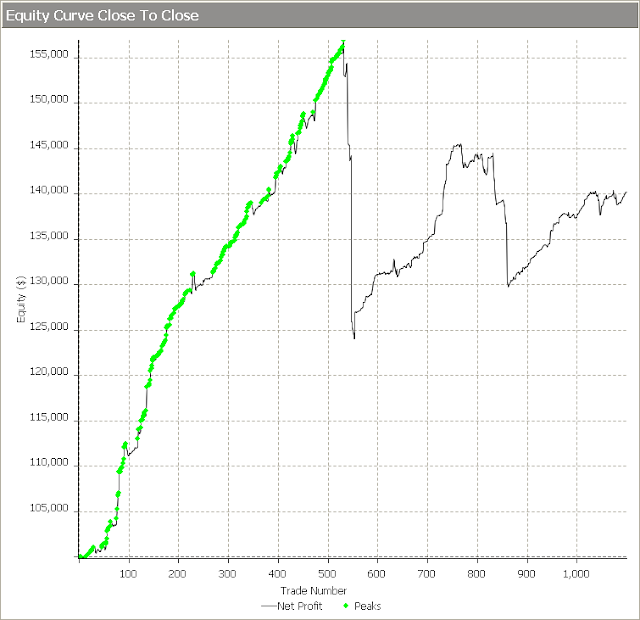 Below is a non optimized or risk managed HLA system (in fact, its the new EURUSD Forex system) running on ES 1 minute data. The ideas was to make a real system trade badly. So, there are a few drawdown trades. Using stops would have eliminated a substantial portion of the profitable trades that the system did execute - so they would not really have been risk management after all. So, there is a major problem. How can you trade without stops?