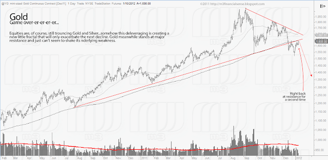 Jamie Dimon, suggests that, with the exception of one or two U.S. banks…american banks are in great shape. I beg to differ with his myopic and self-reinforcing point of view. Globally banks are VERY weak and have continued to increase the risk of their practices with more and more aggressive accounting and book marking activity. Sure, if you want to accept those marks and assumptions - things look a hell of a lot better than they are and possibly just hunky dory. But our next MF Global is waiting and it may well be Goldman Tax or JP MOREgan. Jamie Dimon also suggests that his bank could lose 5 billion to problems in Europe…how much would you like to bet that the number is many orders of magnitude bigger than that even using JPM’s persistent accounting manipulation techniques? The charade is on but at some point soon people will be unmasked.